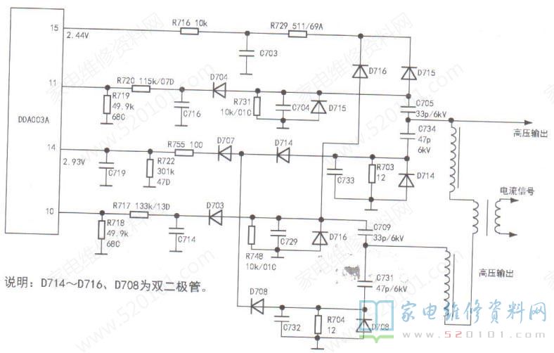 两路高压输出端各有两只高压小容量电容,即上分压电容C705、C734和下分压电容C709、C731,对输出高压进行取样,上分压电容所得取样信号分别经D704、R720和D703、R717等元件降压后送往芯片的10脚和11脚,同时经D715、D716合并后送往15脚;下分压电容的取样信号经D714、D708合并后,送往芯片的14脚,二路电路经构是一样的。观察电路元件,发现14脚外接电阻R755阻值只有1002,15脚外接的R729阻值也不大,而10脚和11脚外接的R720和R717阻值很大。