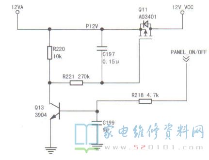 测Q13基极电压为0.67V,集电极电压为0.05V,均正常。Q11源极电压为12V,栅极电压为11.76V,漏极电压为0V,栅极电压偏高,判断Q11损坏。换新后试机,故障排除。此时测得Q11栅极电压为0.05V ,漏极电压为12V,逻辑板上的VGH电压为20.7V,VGL电压为-6V,AVDD电压为15.5V。