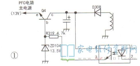 电源板收到开机信号后,光耦导通,Q4因b极得到偏置电压而导通,输出13V电压(vCC电压)供给PFC电路和主电源芯片。