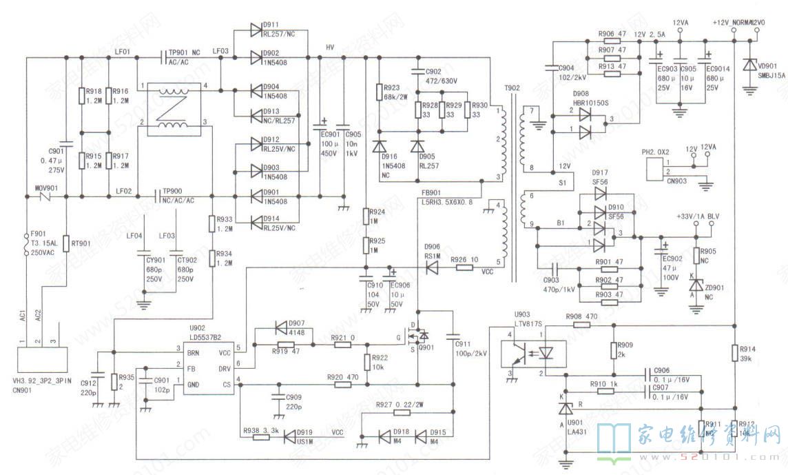 为了快速区分故障点,在D908负端外接12V电压,测得U901的R端电压为2.47V,A极电压是10.45V,U903③、④脚间压降约0.2V;当把外接电压升到12.4V时,U903③、④脚间电压降为0V,说明稳压环路正常,故障点在电源初级。该机电源芯片U902(LD5537B2 )⑤脚为供电端,测其电压在8V~15V之间波动。⑤脚供电有以下两路: -是300V电压经电阻R924、R925降压限流及EC906滤波后供给;二是芯片内部电路启动后,开关变压器④-⑤绕组产生的感应电动势,经D906整流、EC906滤波后供给。