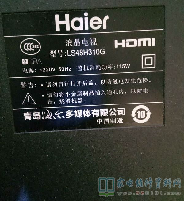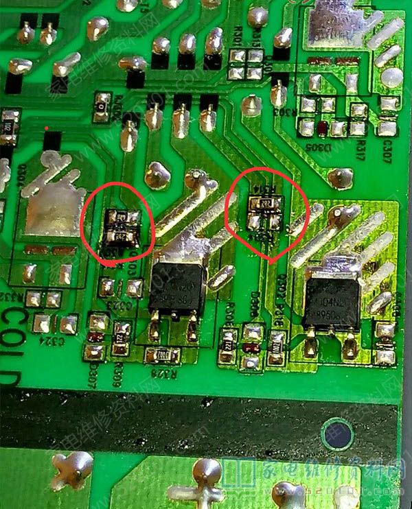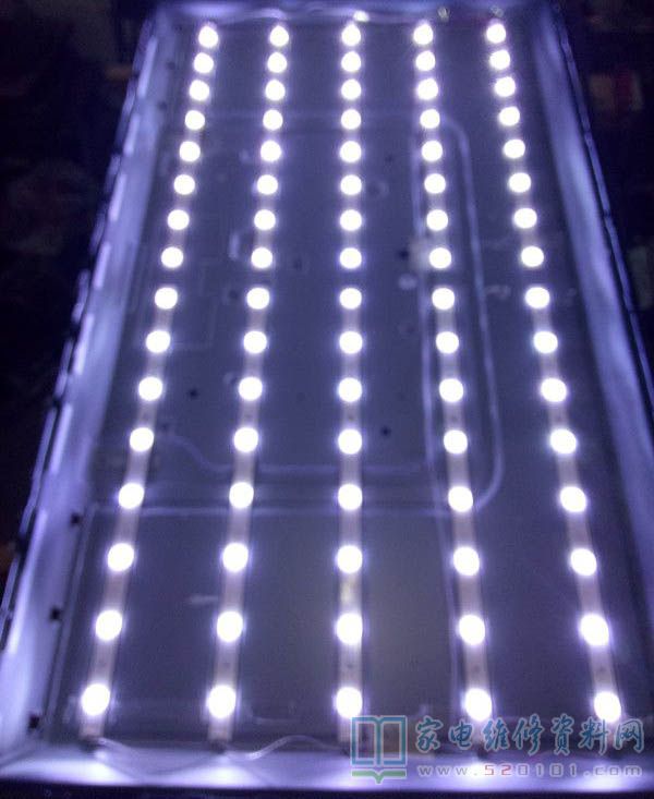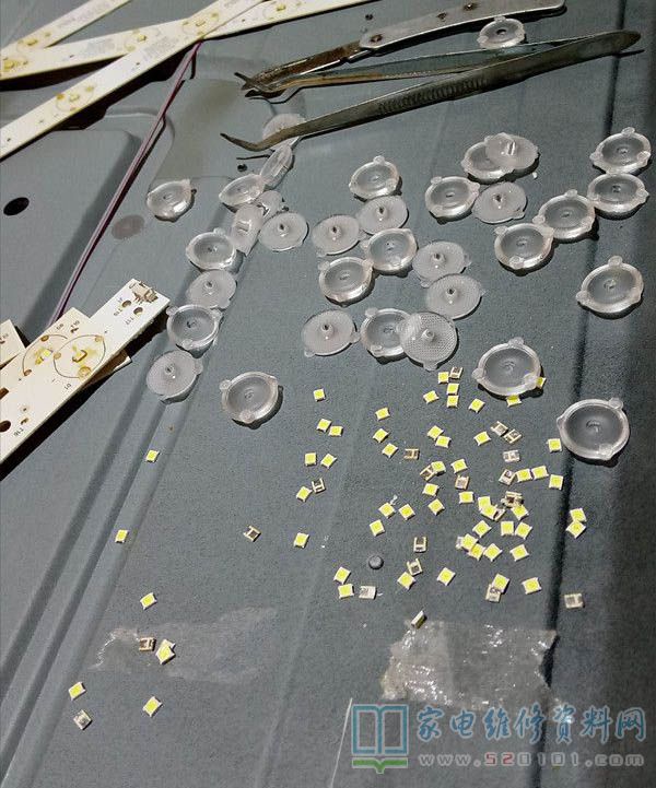 最近接修一台海尔LS48H310G液晶电视,故障表现为开机有声黑屏,测背光输出两组电压150v,初步判断灯条坏,开屏后两组供10条灯条坏了一半灯株,每条都有坏的。换整套得几天到货,屏都拆了,放几天也担心,现成有3V的3528的灯珠换上去也可以,就是费时间活量过大,后来用一上午时间把80个灯珠焊接完。接入电板测试正常,电压110V灯条电流300mA,为了放心,把灯条电流降至220mA,此机用户用了两年半的时间,降电流方法是把恒流输出管的对地电阻取下一只6.8Ω的,具体如下图所示。