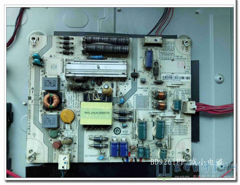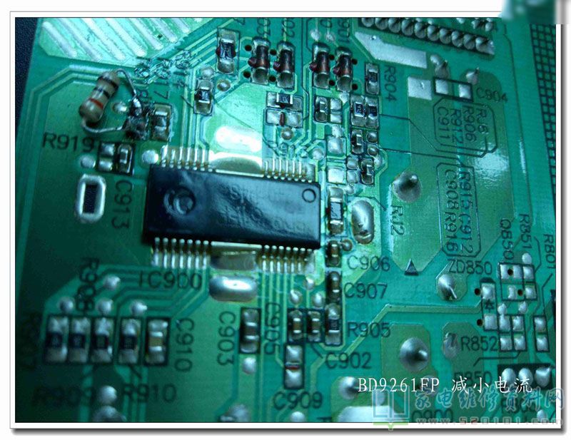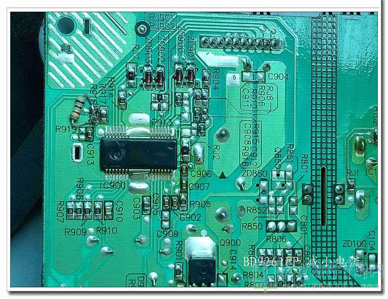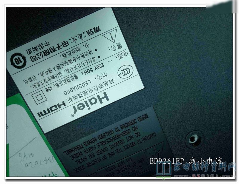 接修一台海尔LED32A950液晶电视,故障表现是通电后屏显厂标后黑屏有暗影,声音正常。拆机,测灯条供电在开机瞬间有上跳后下降的过程,判断灯条问题。拆机,拆屏,灯条是三条 6V 9灯。 其中一只灯珠开路。 用户急用,用一只6V灯珠补好。 试机背光正常点亮。灯条供电57.5V。装好屏,这类维修后习惯调整灯条电流。 看背光恒流用的是BD9261FP芯片。