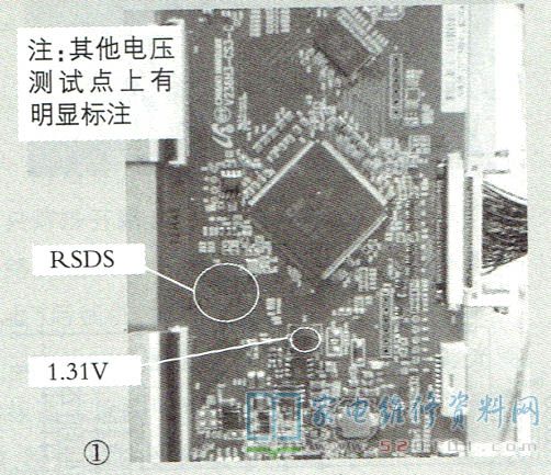 本机逻辑板型号为236H3-CS3-C,屏型号是V390HK1-LS5 REV C8。本机逻辑板上各测试点电压都有明显标注,上电测得VGH、VGL、vCOM、VAA.3.3V、1.8V、1.3V及伽马的阶梯电压都正常。开机几分钟后,手摸逻辑板主芯片CM2970A无温升,怀疑主芯片没工作。测得RSDS信号电压为0.04V~0.1V,明显异常,正常值为1V~1.4V,判断主芯片工作状态异常,怀疑逻辑板的程序数据异常。重写数据后试机,故障排除。该机逻辑板的RSDS信号电压测试点如图1所示。
