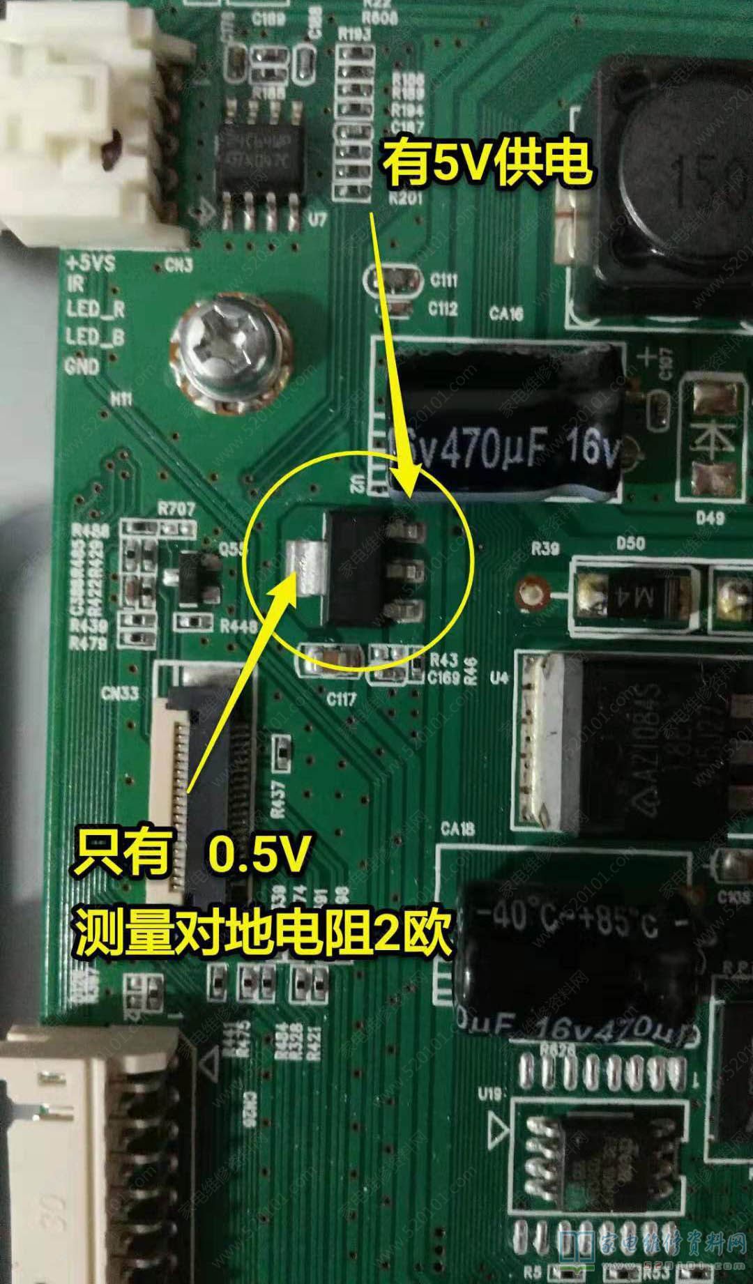 液晶电视,故障表现为开机三无故障,开机后测量电源板输出有5v待机电压,而待机指示红灯却不亮,直接怀疑主板有问题。检查芯片供电U2,一端有5V而输出为0.5V手摸严重发烫,说明3.3输出有短路,继而摸了一下主芯片,烫手!判断芯片短路。因为芯片是BGA 封装,这么大的芯片也没有手工焊过(EMMC倒是换过多次),上网查了一下这个板子还是有点贵的,而芯片只有三十来元,想换的冲动油然而生。