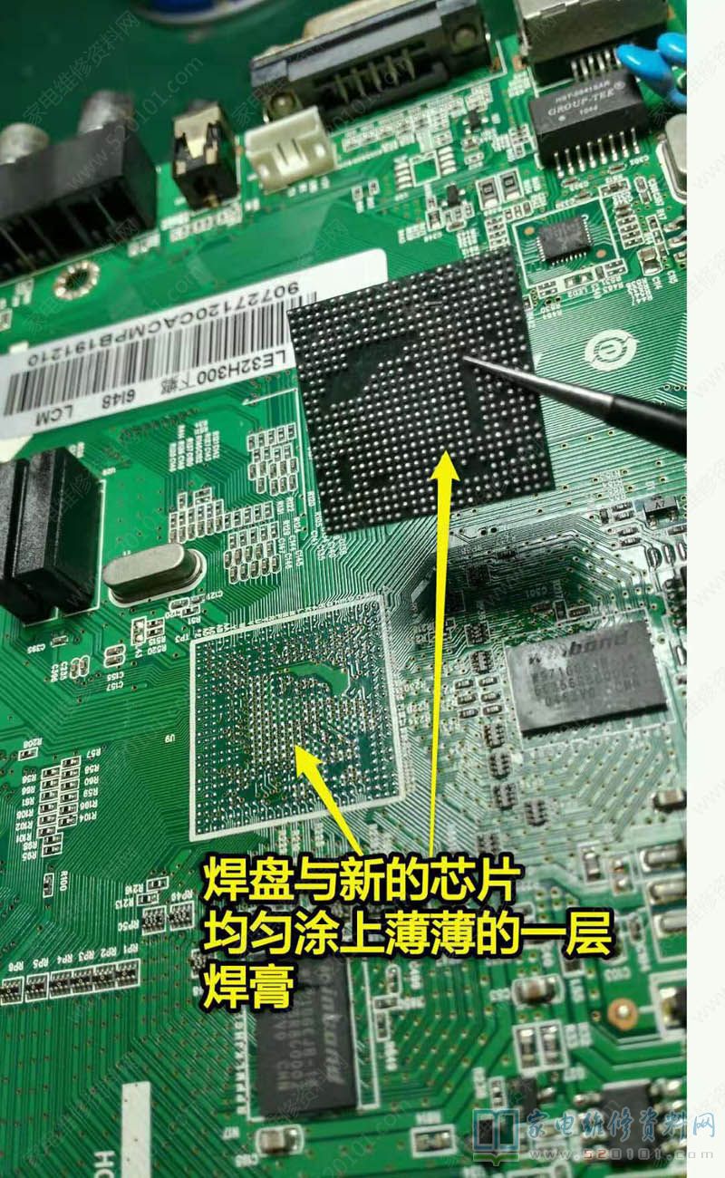 今天芯片到货,原机型号:MSD6I48TXA-LF-TG 购买型号:MST6148ZX-LF-Z1-UB,店家说明可以代换。随即清理焊盘,焊盘与芯片都均匀涂上BGA焊膏,薄薄一层就可以,快克853用于底部加热,温度200左右,预热几分钟后,开启热风枪,调节至380度左右,40的风速,间隔芯片一厘米左右均匀晃动,当焊膏加热冒烟时,用镊子轻轻推一下芯片能自动回位就说明基本成功了,撤掉风枪关掉预热台,让板子自然冷却后,试机,没想到彩电成功开机了图像伴音均正常。常常看到论坛有大师手工换BGA,今天我也能换上了,大芯片第一次还居然成功!
