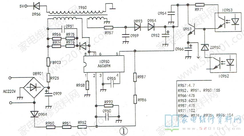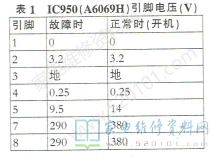 A6069H 引脚电压见表1。细查IC950供电电路,测二极管D904正常,启动电阻R950~R952(阻值标注均为“155”)均正常,但二次供电支路贴片电阻R957(4.7Ω)开路,其他未见异常。更换R957后,IC950的⑤脚电压升至14V,待机5V电压正常。强制开机后,在12V、24V输出电压也正常。将电源板装回电视机后试机,故障排除。