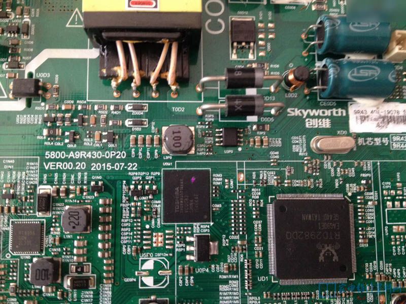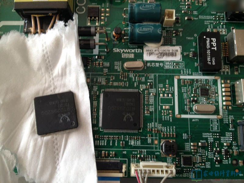 接修一台创维液晶电视32E3500,遭雷击损坏,拆开机器,首先检查主芯片RTD2982DQ严重发热,供电端电阻较小,去掉主芯片后短路消失,这个智能主板较贵,于是决定换芯片修复。于是去马云家看芯片,发现买个这个芯片的评论不是很理想,也就是这个芯片更换有风险,还有就是对芯片通用新不太了解。结果找了一家态度好点的,他说只要型号一样就行,于是决定换芯片修复。昨天芯片收到了,今天就来更换,由于这个芯片有大面积散热,于是发在LED灯珠加热器上面,上面再用热风枪加热,不一会坏的芯片取下来了,清洗电路板,将好的芯片脚位对齐,下面也用LED加热器加热一会,待芯片固定后,于是用电烙铁拖焊几遍,检查芯片无焊接短路后,上机电视机搞定。维修总结:1、这个RTD2982DQ是通用的,2、这个芯片可以买到好芯片的。