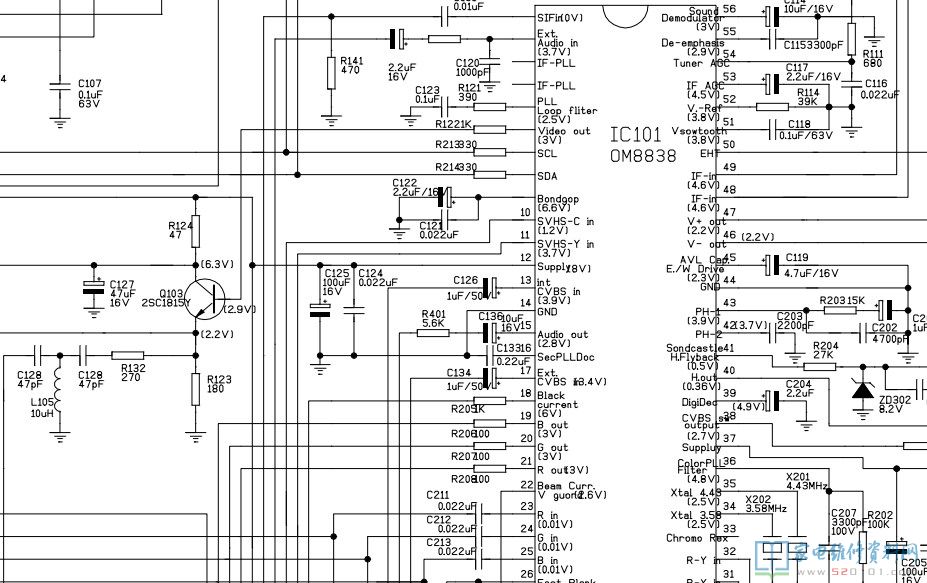 接修一台创维数码8000-2199A彩电,故障是视频输入一直是黑屏,查视频输入端(17)脚击穿。分析可以改由内视频输入代替之拆下C126,从C134正端跳线到C126正端,把视频输入改接到(13)脚内视频输入端;伴音部分把C403正极焊脱,A1跳线到C403正极。开机,在TV状态 图声接好皆好,且音量控制正常。15分钟即可使OM8838起死回生。