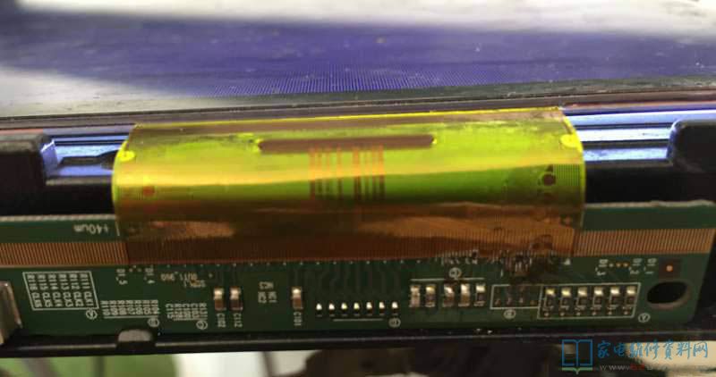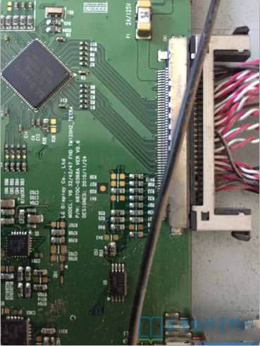 更换后VGH电压26V,VDA电压17.7V。插上双排线,图像已能显示,但是最右侧10cm竖带黑屏,应该是有一组TAB没有工作,且整体屏幕微暗。看样子是要拆屏看看了。拆开后发现右侧屏副板TAB处已经腐蚀,酒精清洗后,拆下屏在显微镜下观察,大约有20条线腐蚀断线,只能飞线了,拿来平时修手机用的线还是有点粗,毕竟断线都是紧挨着,比较密,只好采用手机听筒里面的铜丝了,柔度好,易飞线,足足飞了一个多小时,才完全飞完,上屏试机,屏的亮度一致了,右侧图像也出来了,但是却有黑色的满屏横线,拔掉右侧排线,左侧显示正常,图像很好,故障还是在右侧,将屏重新拆下到显微镜下查验是否有短路焊连的情况。未有发现,焊接都良好,电路元件无损坏,决定上屏重新测试,冒险热插拔右侧屏线,轻微上下活动接口处屏线,发现屏有瞬间正常现象,压下排线口,还是有满屏横黑线。琢磨间想起了刀割法修屏,于是拿起烙铁将最右侧的两根飞线去下,屏幕恢复正常。用测屏仪测试各种色彩频率下均正常。绿油固化,维修结束。