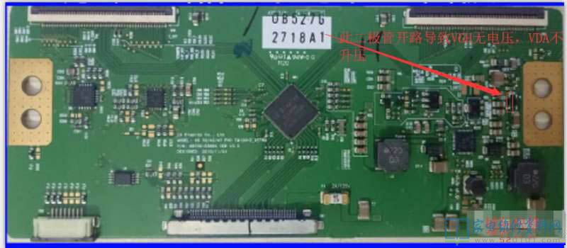 接修一台创维32E82RD液晶电视,客户描述进水后灰屏、黑屏,已经在别处放修一周多,维修无果,遂经人介绍转至我处,询问客户故障原因,客户描述正常使用突发故障,开机测试,有创维开机提示音,背光亮,灰屏后黑屏。主板应该正常,打开盖检查,测试各供电正常,该机屏处为LG屏,逻辑板为单独式,属于一进二出的那种,分别交换断开到屏上的两根排线,均不出图像,没有任何反应,考虑逻辑板应该有故障,测量逻辑板主供电12V正常,次电压1.2V 1.8V 3.3V VGL-4.9V等均正常,唯独VGH无电压,且VDA电压只有11.5V左右,理论上VDA升压后应该有15v以上20V以下的电压。此电压应该是是VGH的基础电压,查DC-DC芯片输出及二极管升压电路,测量发现,图中二极管已经开路,如下图所示。