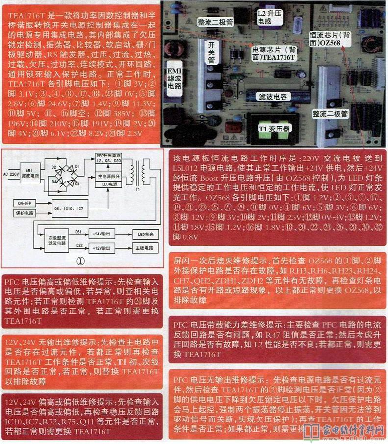 创维168P-L5L012电源板应用于42E820U等型号液晶电视中,其电路信号流程如下图所示,220V交流电经EMI滤波、桥式整流后送往电源电路,主电源电路开始工作,得到380V的PFC供电,LLC电源电路正常工作,得到+12V、+24V供电,其中+24V为背光供电,+12为主板电路供电。Q6、IC10、IC7及其外围元件组成待机控制电路,此电路控制IC1(TEA1716T)工作、待机或不工作。