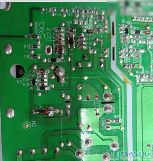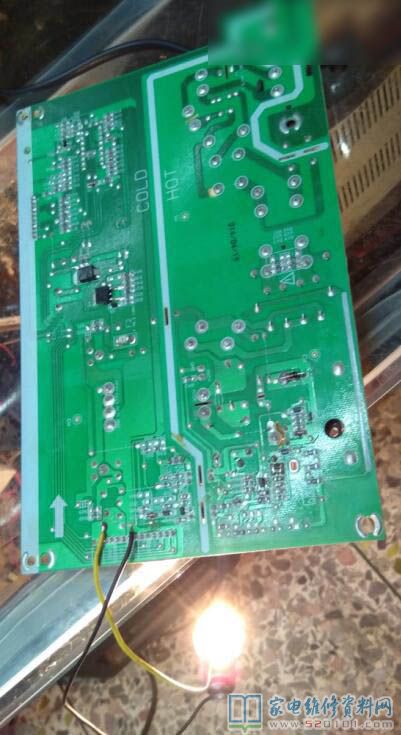 接修一台创维液晶电视,该机器采用L2N011电源板,故障表现为开机三无,拆开机器 查D6,D12(FU4007),ZD2(2.7v稳压管),IC3(六脚贴片5AAA,其实是NCP1251的缩写)全部短路,更换上述配件后,12v输出2.12v,查IC5(TL431) A-K脚短路,更换后接摩托车灯泡测试12V输出端11.76V,装上机器试机一切正常。
