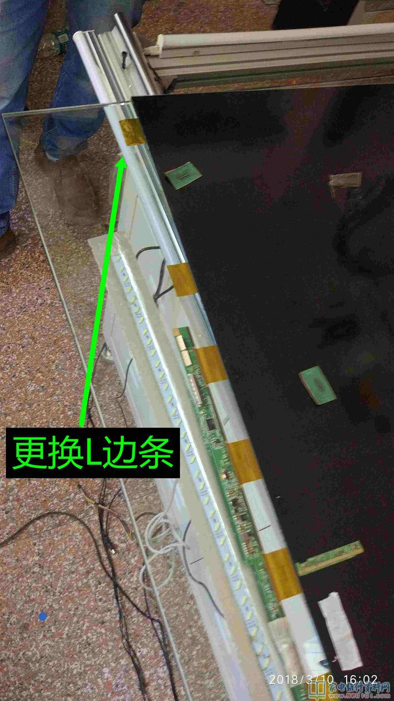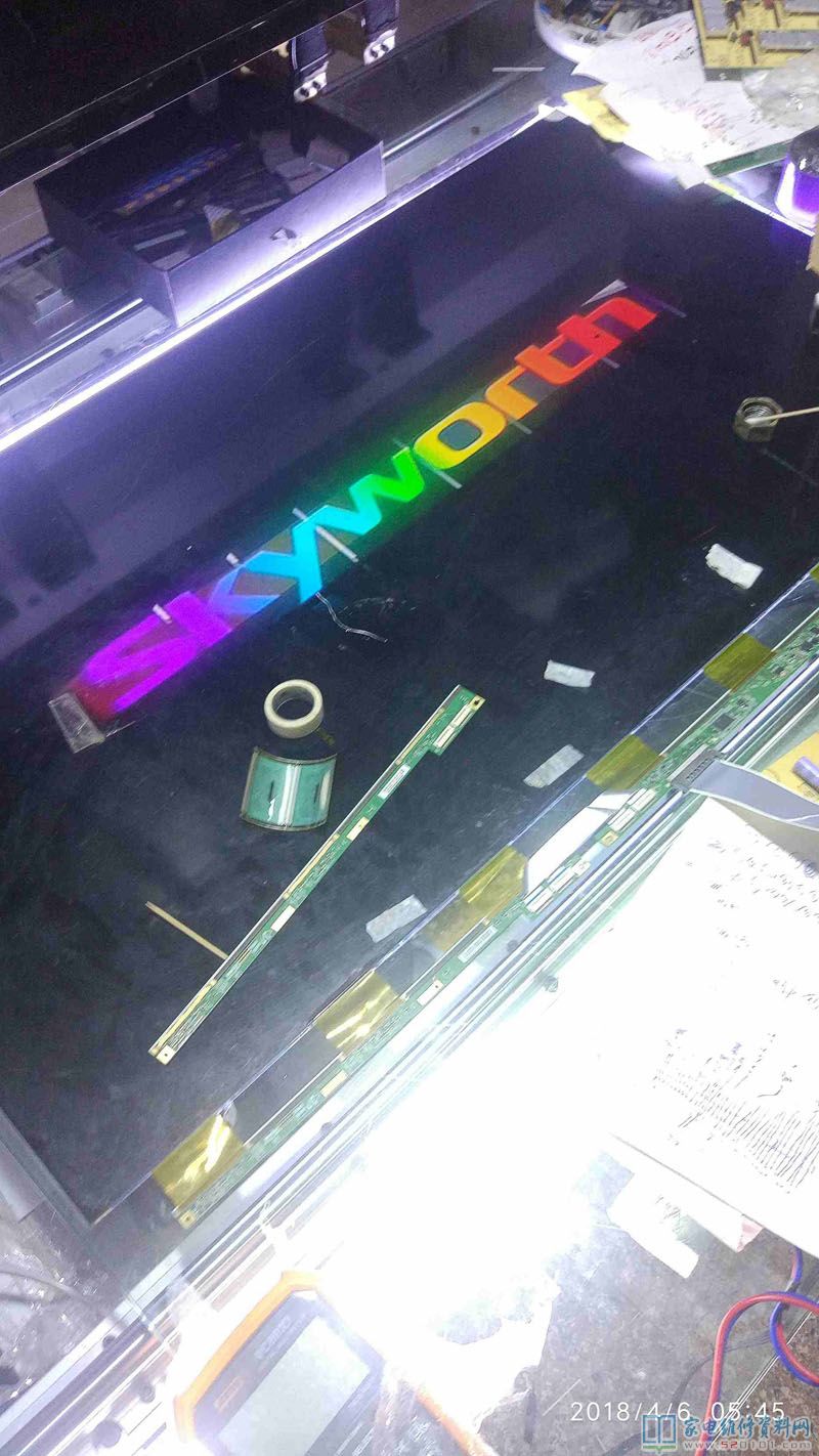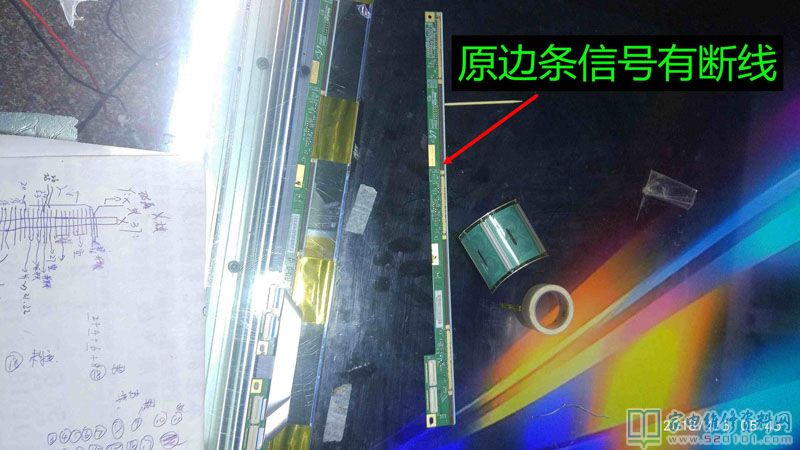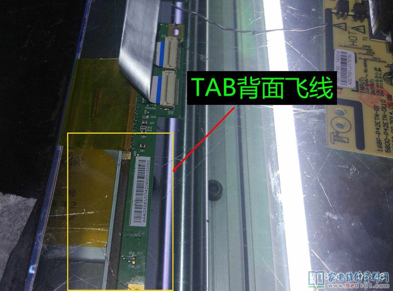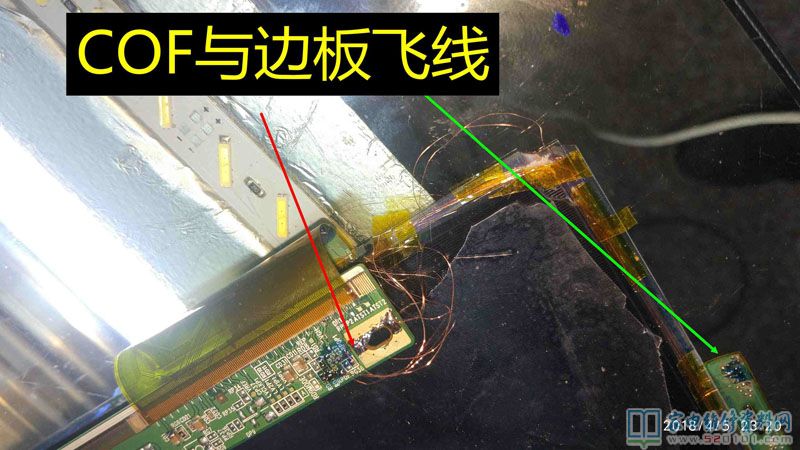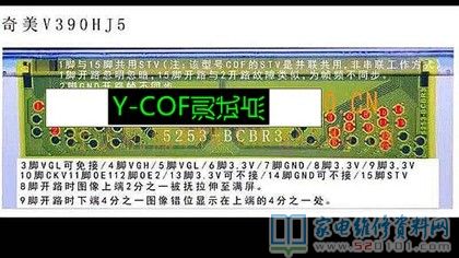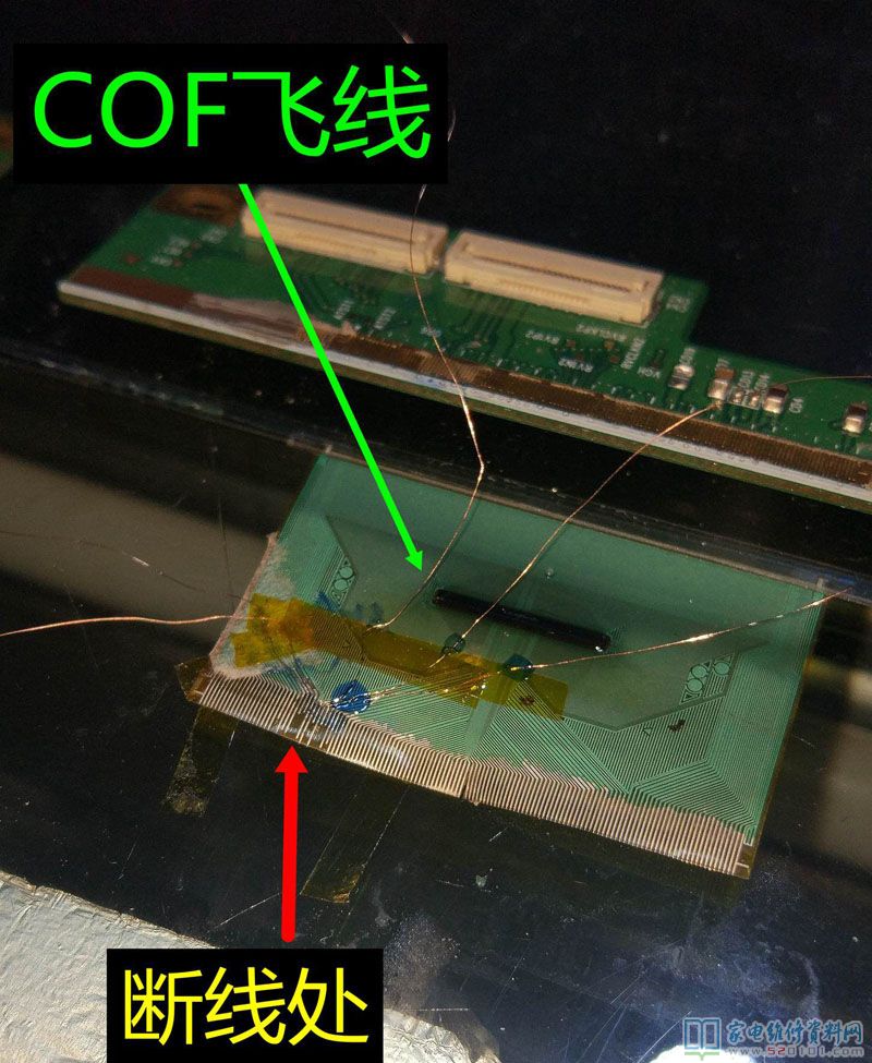 接修一台创维40E360E液晶电视,这是一台进了水的电视机,用户说楼顶漏水导致的,通电试机,有声音,但图像翻滚,类似于CRT的场不同步的状况,拆机经查屏为奇美39寸,边条L有腐蚀,更换L边条无效,经显微镜查看后,玻璃内部有断线,X3-COF有断线,查Y—COF缺OE1,OE2,STV,CPV,CKV电压,后经边板飞线至Y,X3闲麻烦不想换,边板飞线至X3背面,飞线后用金手指固定,用蓝胶做防潮绝缘处理完美修复。