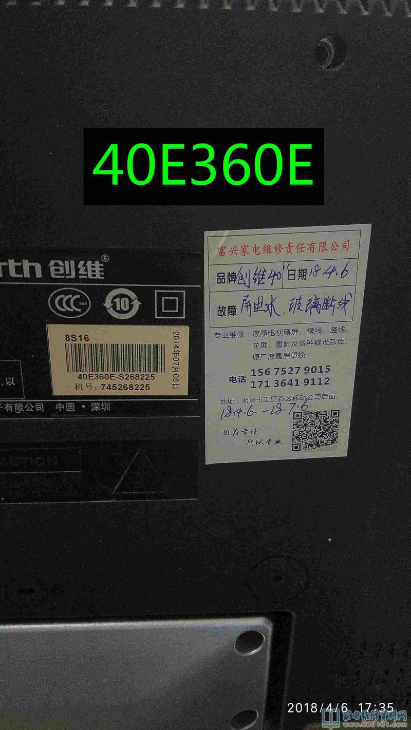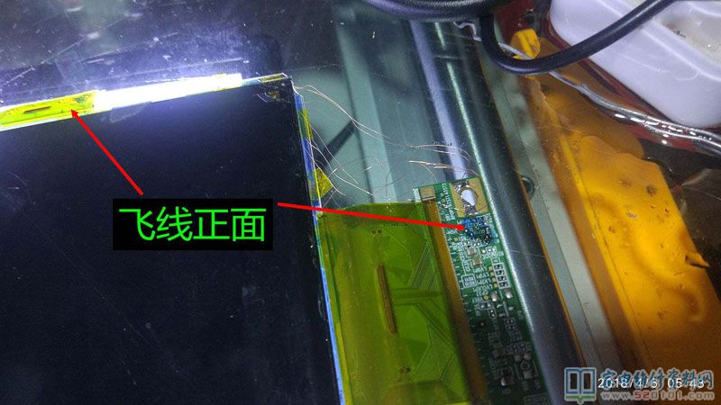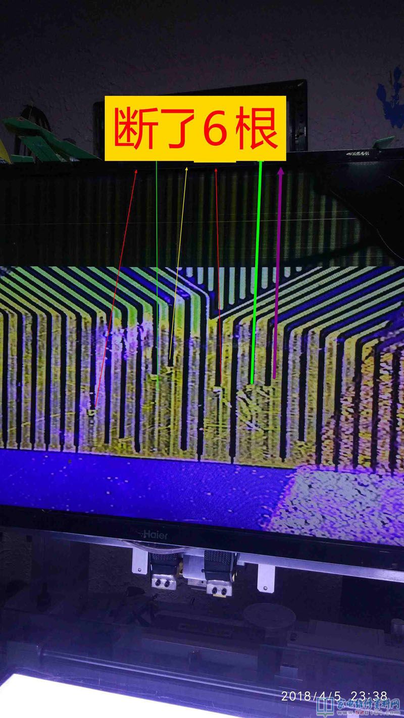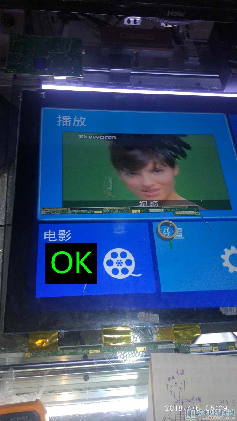 接修一台创维40E360E液晶电视,这是一台进了水的电视机,用户说楼顶漏水导致的,通电试机,有声音,但图像翻滚,类似于CRT的场不同步的状况,拆机经查屏为奇美39寸,边条L有腐蚀,更换L边条无效,经显微镜查看后,玻璃内部有断线,X3-COF有断线,查Y—COF缺OE1,OE2,STV,CPV,CKV电压,后经边板飞线至Y,X3闲麻烦不想换,边板飞线至X3背面,飞线后用金手指固定,用蓝胶做防潮绝缘处理完美修复。