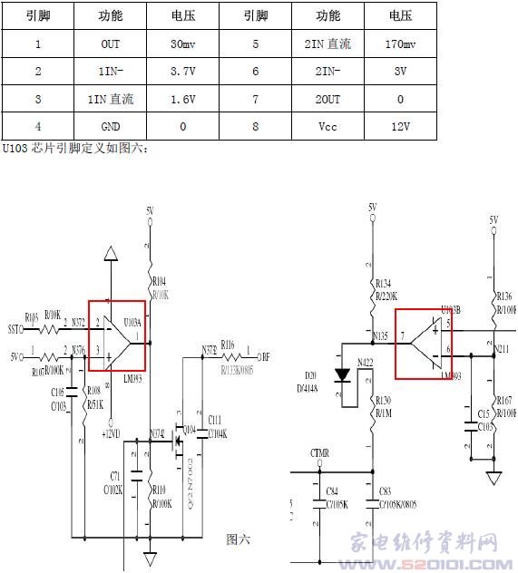 7、U103(LM393)引脚功能及电压(在接背光正常工作下测量),引脚定义如图