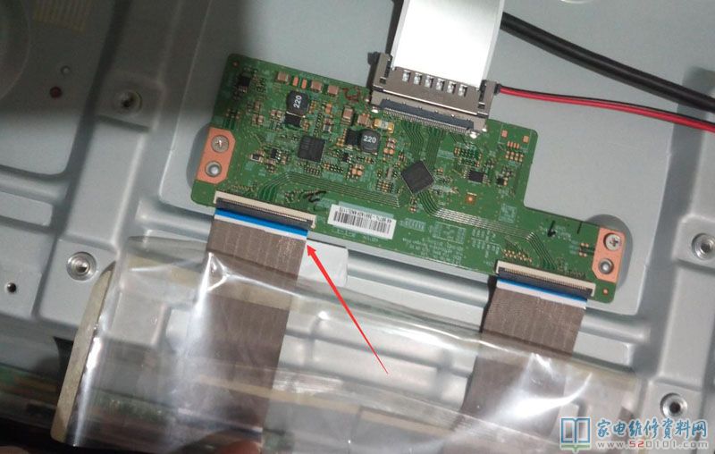 接修一台创维49寸49E360E液晶电视,客户说创维官方售后和他讲已确定屏坏,所以他抱着试一试的办法拿到我维修部,这台电视的故障表现就是液晶屏下半边出现横线花屏干扰(具体看下面的图片),后来经过排查,液晶屏排线把那几个对应的线用纸隔开了(和电路分离了,和割一刀是同一个原理,具体看下图箭头表示),机器修复。