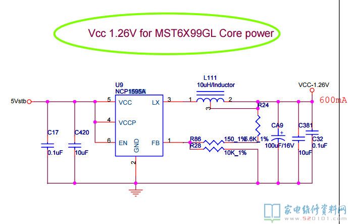 创维42L01HF液晶电视(8M19机芯)由于U9/1595A击穿损坏引起不开机的故障比较多,在换过1595A以后一定要测其电压是否1.26V。如偏高,一定要测R24阻值是否正常(5.6K),或者干脆换掉,笔者维修中发现多例R24阻值变大,1.26V升高至4.V左右,MST6M19发热烧坏。(有的PCB板R24处打胶,不易发现)