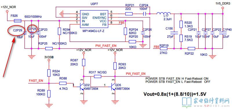接修一台创维55E7200液晶电视(8H87机芯)故障表现不开机,拿到主板后(板号5800-A8H870-1P00)发现电感FB26烧糊,测C2P29电容两端短路,摘下U0P7块,测电容两端还短路,将C2P25,C2P29电容摘下测发现短路一个,将两个电容都换新,电感也换新,U0P7块上回通电试机一切正常。