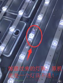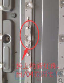 新灯珠是我原先买的新灯条上取得,不单独取灯珠,用几个就连灯珠背面的板子直接用壁纸刀子隔断(这样的换的目的是电罗铁加热不到灯珠,不会造成二次取灯珠高温加热对灯珠的伤害)把原机坏的灯珠去掉,把割下来的新灯珠和背面的板子用704胶粘在坏灯珠的位置,两边用导线连接好就可以了。