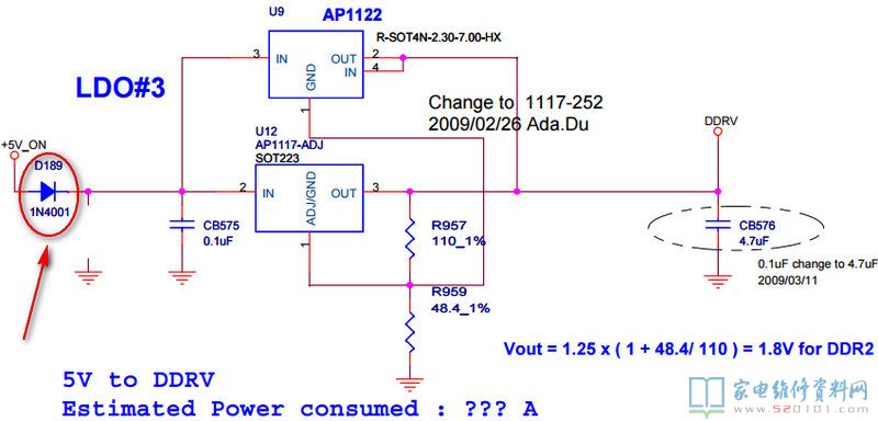 接修一台创维32L05HR液晶电视,故障表现为不定时不开机的故障,拆开机器检测发现电源板输出电压都正常;机芯板故障,检测发现 U12(正常为1.8V)实际只有1.0V左右,顺着电路检测发现U12的供电只有2V左右,测量发现D189负极电压不正常,代换后开机正常。