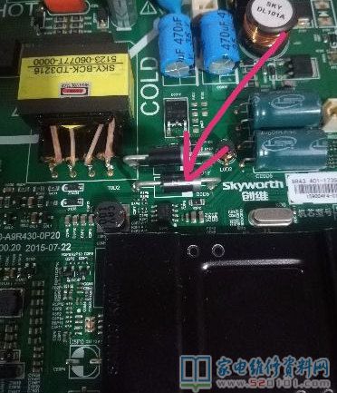 接修一台用户送来的创维32E3500液晶电视,这台电视的故障表现为开机三无,拆开机器,经查故障点为电源板上的二极管SB5100短路导致(位置如下图红圈标注),因手头上无次配件,故用MB5200代换上,没有问题,故障已修复。
