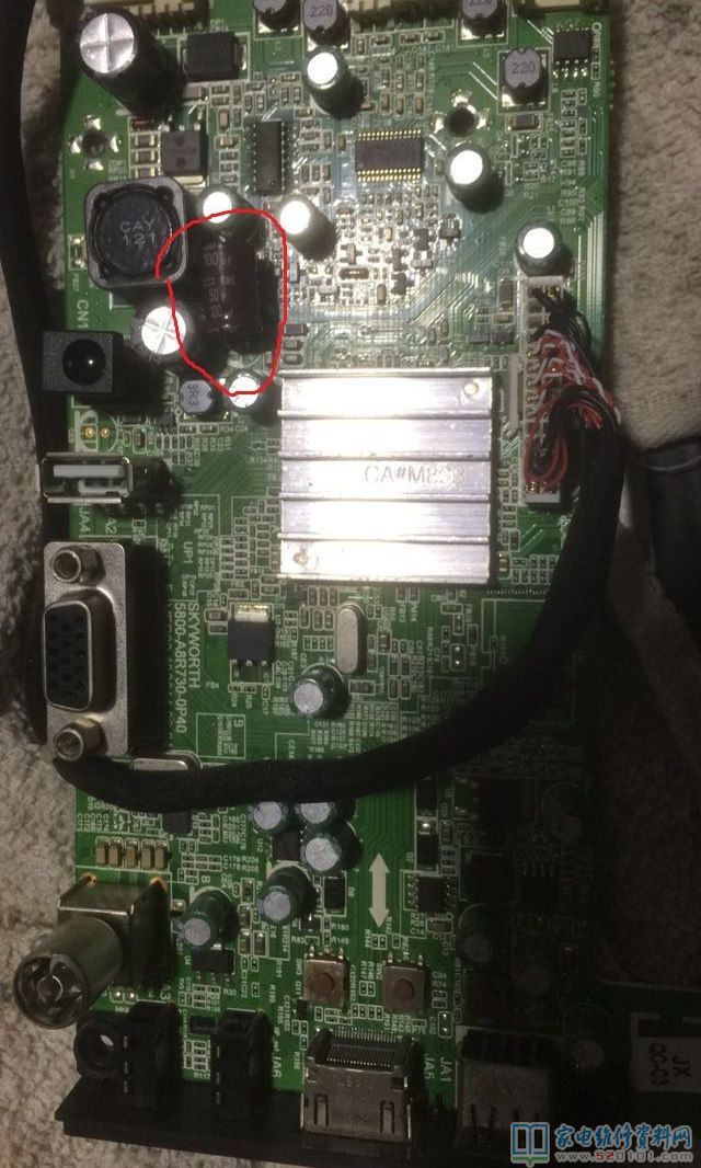 接修一台创维24E510E液晶电视,采用的是8R73机芯,故障表现是反复重启;刚开始以为是数据坏,马上重写数据,白高兴一场,不是数据的问题,在网上查阅此类问题相关资料,发现有一个朋友也是换数据没用,用吹风机一加热就可以解决此类故障,我也试着用的的加热方法,加热从电解电容开始,一个一个的元器件加热,发现是下图中电解电容故障导致,更换后通电试机,故障修复。