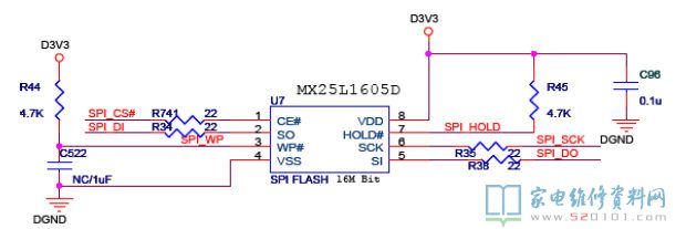 U7 中存放着主芯片正常运行所用到的程序,U7 的供电为D3V3,通过SPI_CS#(片选信号)、SPI_DI(串行数据输入)、SPI_WP(读写控制)、SPI_DO(串行数制输出)、SPI_HOLD(数据锁存)、