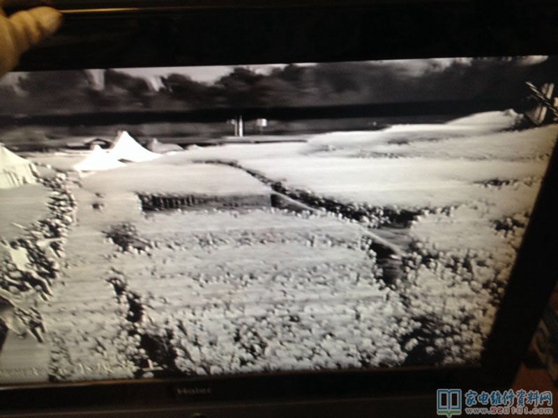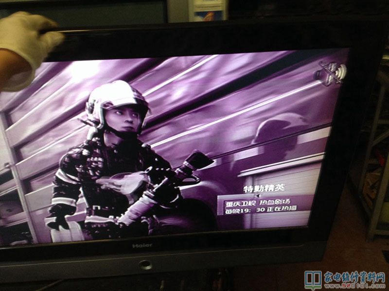 接修一台海尔L37A9A-K液晶电视,故障现象是出现彩色偏红,图像有红色横细线干扰,就类似于老式电视机300V滤波不良,不过是红色细线干扰。下面的两张故障图片第一张是未修复关掉颜色的图片,第二张是修复偏色很细线干扰图片,图片描述不够准确,放大可以仔细看出,还有这电视机修复颜色后发现无法收台和无伴音。