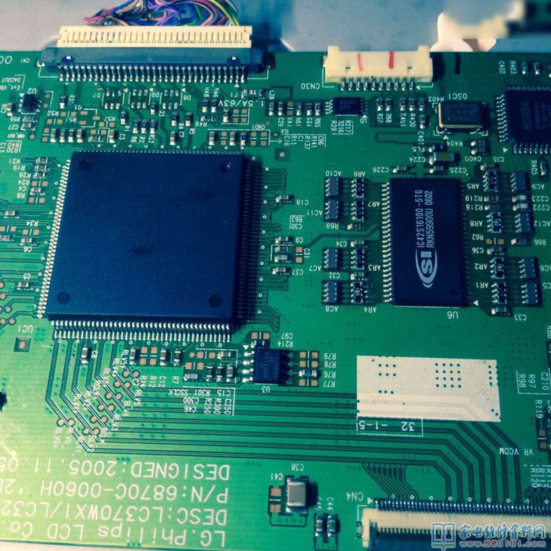 这机器起初以为是屏幕故障,不过几经检测找到该机器逻辑板电路图,最后将故障锁定逻辑板。最后查出逻辑板上面缓存AR2,AR4变质,换AR4图像黑白正常,不过还是有横细线干扰,换掉AR2后电视机黑白图像完全恢复。当电视机修复后发现伴音没有,过后查出伴音音量处理器r2s15900总线短路,这才知道为啥机器无法收台的原因。过后查出短路点在主板,由于我出都有机顶盒,于是伴音跨接音频处理器,将电视机修复。