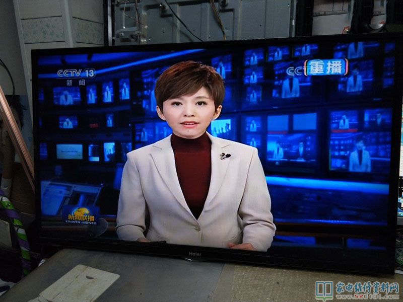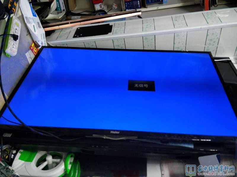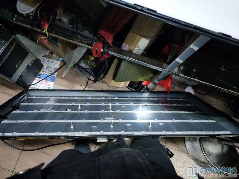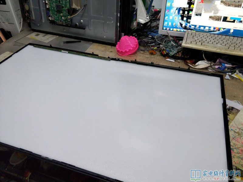 接修一台海尔LE46M330P液晶电视,故障表现为中间一条明显不亮,如下图所示,有时开机就黑屏,有时放着不定时黑屏,蓝屏时中间一条明显不亮,网购全新5对10条灯管。全部更换,以免后患。经过研究,拆开后盖后,发现屏和边框一体的扣起来的,不小心就会把屏线搞断了。