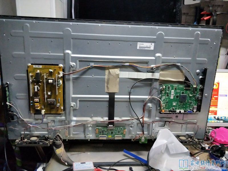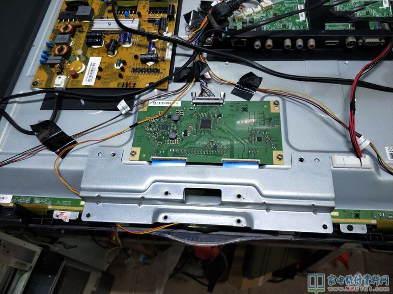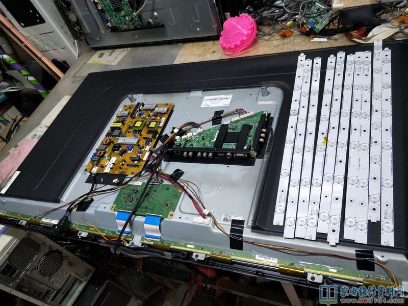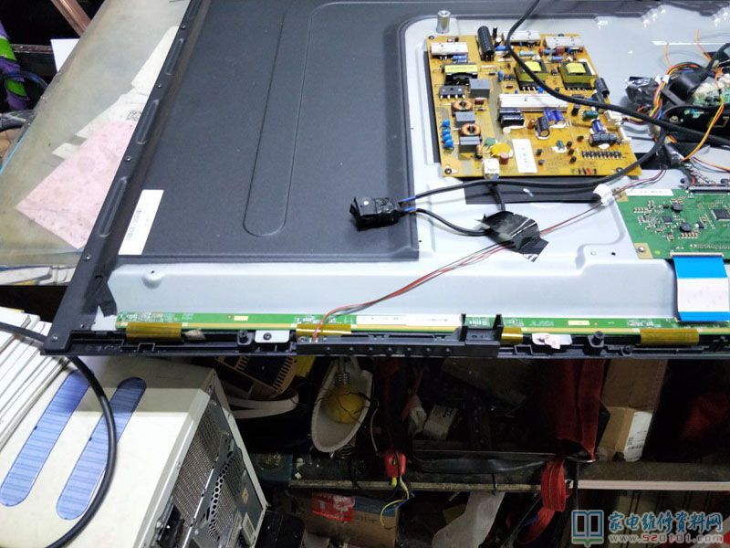后壳出了几块铁片是插到逻辑板的排线空隙里的。拆的时候,一定把电视爬到桌子上,螺丝全拆好,先把屏线边一边抬高,慢慢向外拉出来。在这之前,先把逻辑板与后铁壳分离,用软纸插入。用刀片轻轻割分离。就可以拿出来,如装片所示,装的时候,也是把后壳屏逻辑板那边先插入,再慢慢放好,检查排线用手按,不受力时候,胶布固定装好,就可以了。
