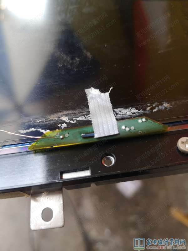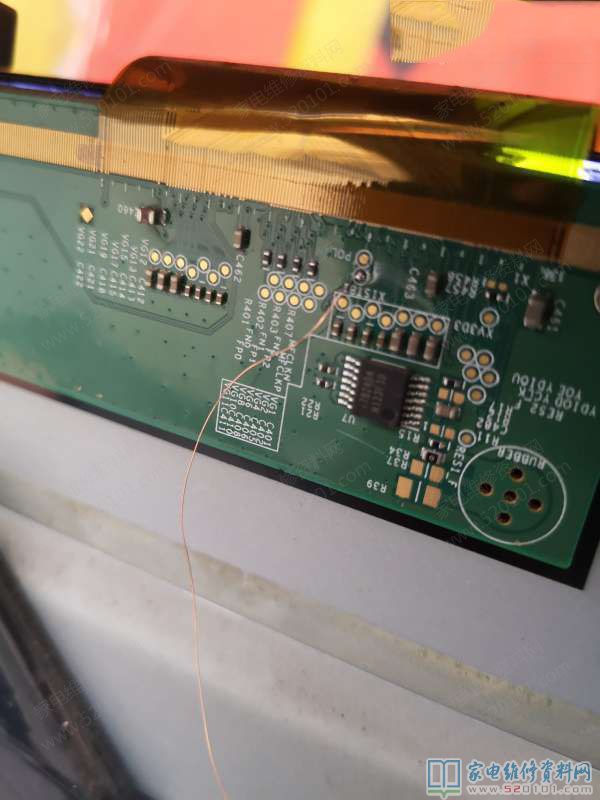 这可能是行列驱动信号断路了,在这点上飞根线,再从边板上找找这个信号是从哪来的,但是边板上的测试点茫茫多,看了半天也没有头绪,想到Y信号应该是从距它最近的X cof上过来的,先从最近的cof旁边的测试找起吧,当飞线接触到标识为POL的测试点时,下半图像正常。这个测试点有两个,接触到上面的时下半图像会出现压缩的上半部图像,这个点可能是上半图像驱动信号。