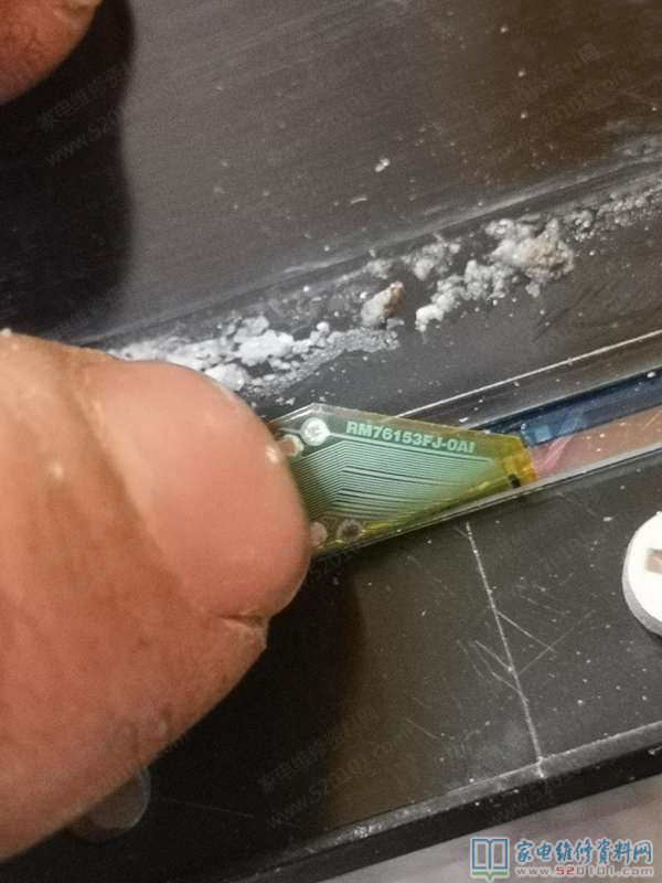 将COF上的点刮开测量VGH VGL 3.3V都正常,当测到这个点时,发现下半部图像出现了横纹并闪动。