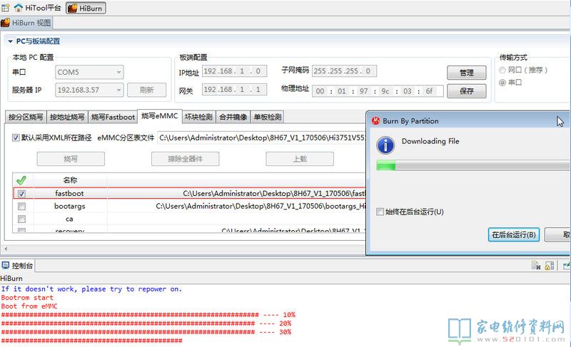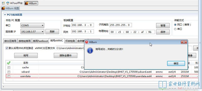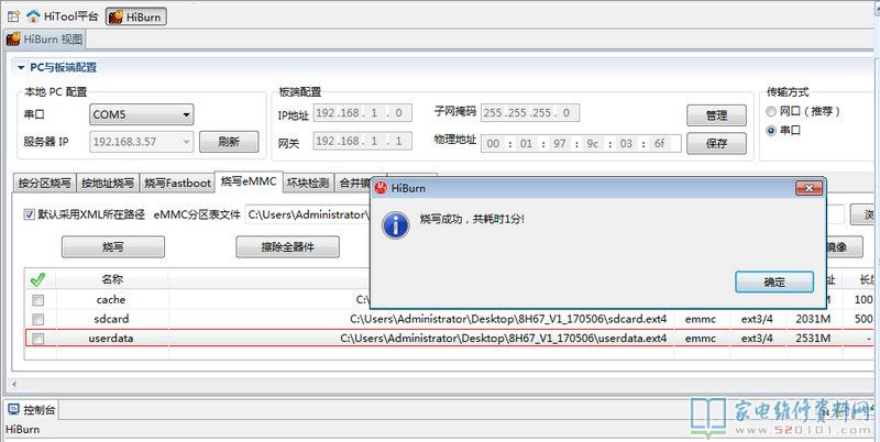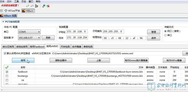 说明:如果系统连引导程序都跑不起来,或者已更换新的空白的EMMC,就需要通过电脑工具Hitool 来将引导程序写到EMMC 里面,烧写成功后,再用强制升级方法或串口指令升级方