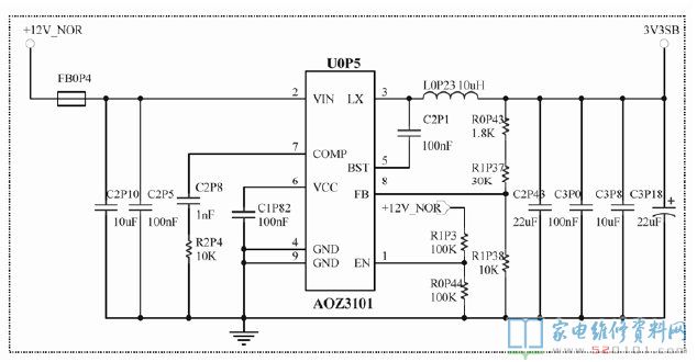 如图13 所示,电源板送来的+12V_NOR 供电经U0P5(AOZ3101)为核心的DC-DC 变换电路的变换,得到3V3SB 供电,用作相关电路工作供电。