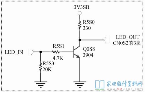 如图15 所示,在U2(Hi3751 V551)正常工作后,U2(Hi3751 V551)的AG3 脚输出指示灯控制信号(高电平),此信号送到Q0S8 的基极,使Q0S8 导通,其集电极输出低电平,送到指示灯开关控制电路。