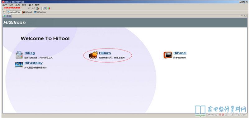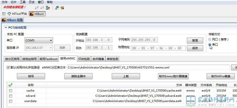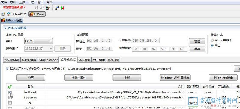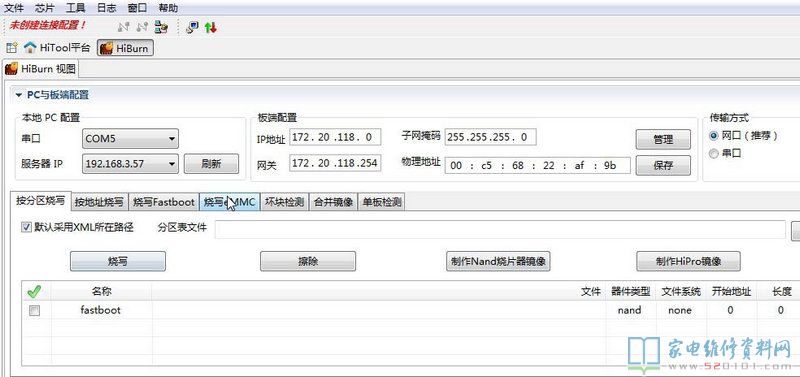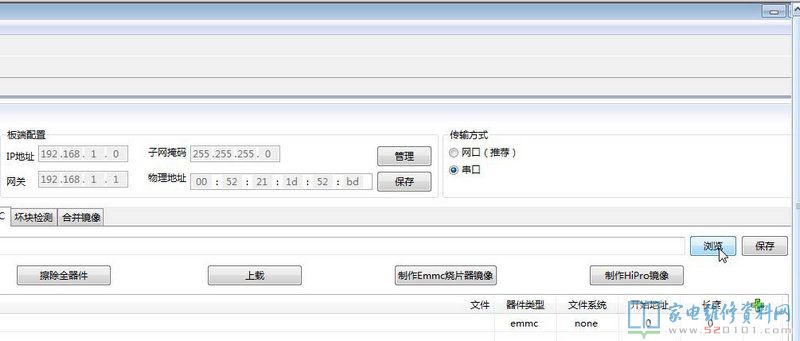 ②、选择HiBurn 功能进入烧写界面,之后选择“串口”(如果只写引导程序,那么可以在右边的传输方式中选择串口烧写,无需使用网线)。