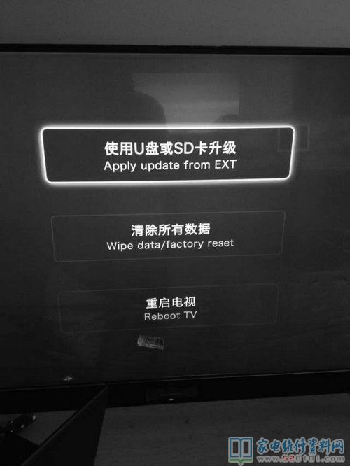 ②、电视待机状态下,将U 盘插入电视机的相应端口,按住键控板的开机键再开机。按住20 秒左右,系统会自动进入升级界面,选择U 盘内的升级包升级。