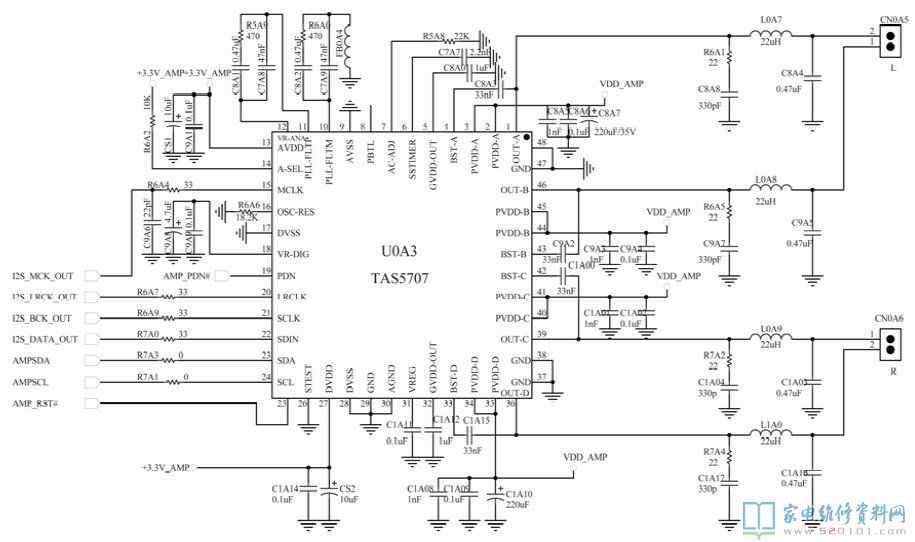 如图18 所示,U0A3(TAS5707)是数字音频功放集成电路,其中,○19 脚是待机控制脚,○25 脚是复位脚,○23 (SDA)脚、○24 (SCL)脚为数据、时钟总线脚,○15 (MCLK)脚为主时钟输 入脚,○21 (SCLK)脚为串行音频数据/位时钟输入脚,○20 (LRCLK)脚为串行音频数据左右/帧 时钟输入脚,○22 (SDIN)脚为串行音频数据输入脚。