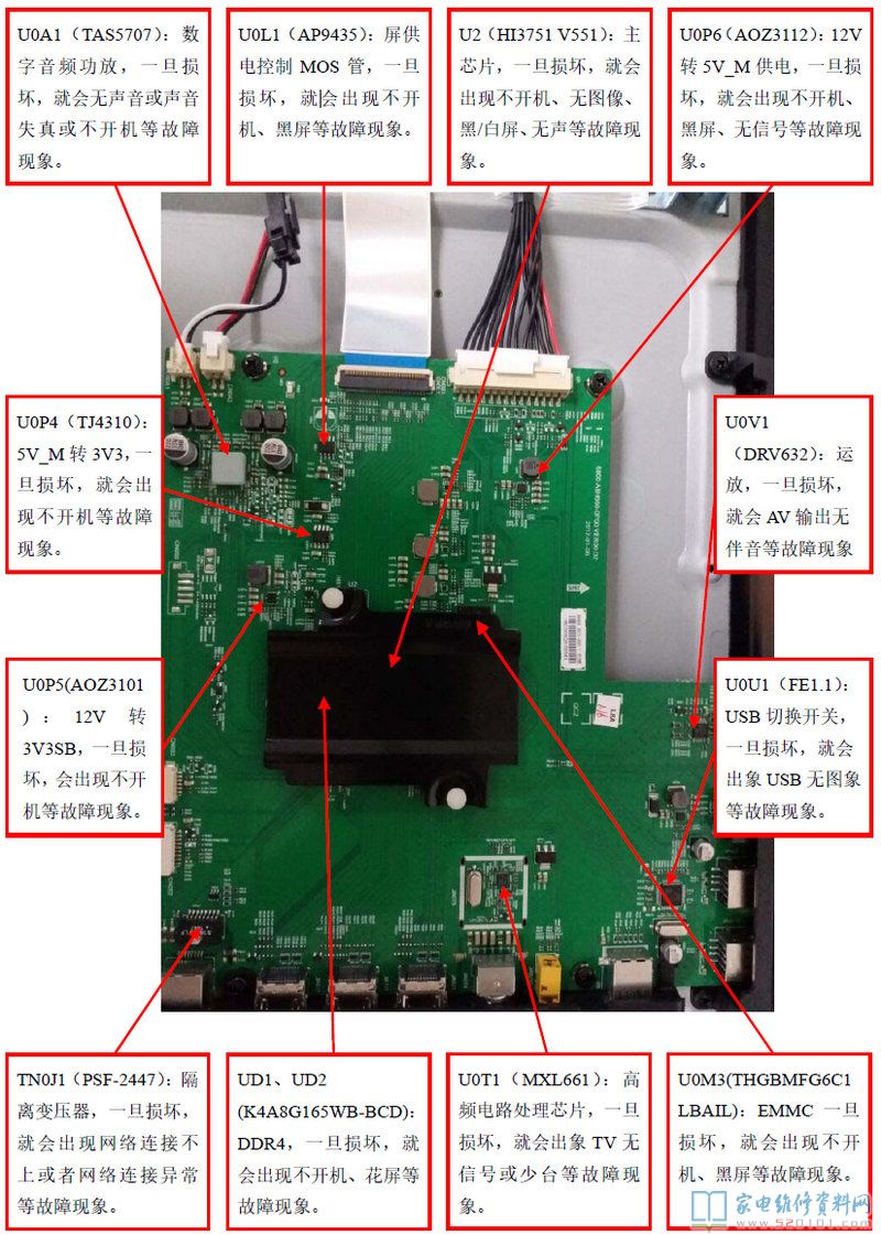 (4) U2(Hi3751 V551)输出的PWR_ON/OFF开机信号,得到的PWR_ON/OFF高电平送往电源板,于是电源板电路正常工作,产生正常的12V、36V,给主板电路供电,背光板电路供电。
