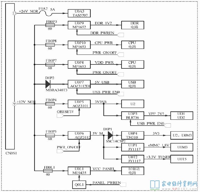 如图11 所示,电源板送来的+24V_NOR,给U0A3 供电;电源板送来的+12V_NOR 供电, 经各稳压电路稳压或变换电路变压后,送给相应的电路。+12V_NOR 供电分七路:一路经U0L1, 得到VCC_PANEL 供电,给屏驱动电路供电;一路经U0P9(MP1652)变换,得到DDR_1V2 供电,给主芯片、DDR 电路等供电;一路经U0P10(MP1653),得到CPU_PWR 供电,给主芯 片CPU 供电;一路经U0P8(MP1653),得到VDD_PWR 供电,为主芯片内核供电;一路经 U0P7(AOZ3112DI),得到5V_USB 供电,给USB 电路等供电;一路经U0P5(AOZ3101),得到3V3SB 供电,给主芯片等供电;一路经U0P6(AOZ3112),得5V_M 供电;5V_M 供电分三路,分别给U2、U0M3、U0T5 等电路供电。