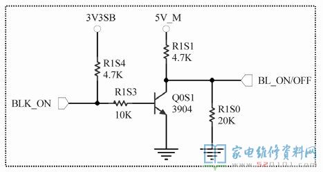 如图16 所示,主芯片U2(Hi3751 V551)的J29 脚送来的BLK_ON 背光开关控制信号,经Q0S1 倒相,由CN0S4 的①脚送到背光电路,用于控制背光板电路是否工作。