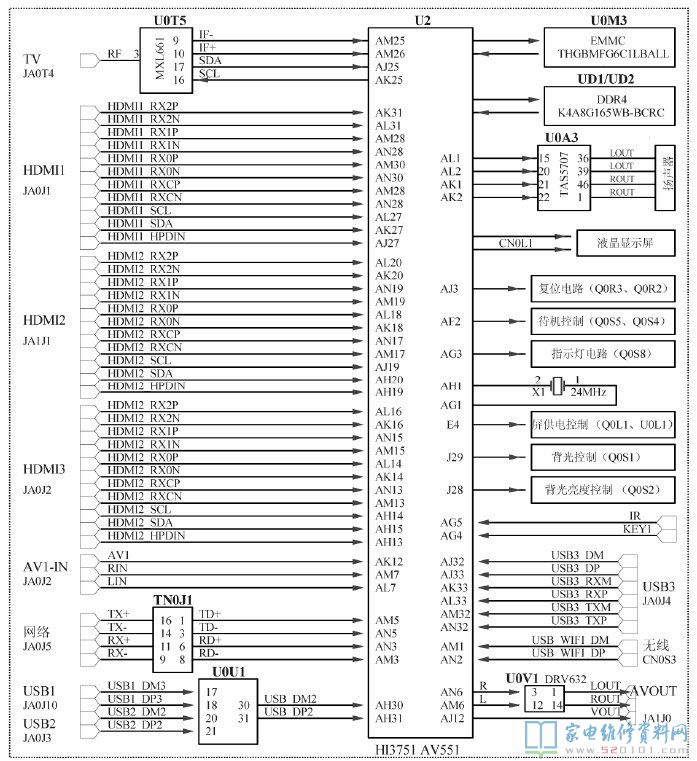 如图12所示,为信号处理电路系统结构框图,其中,U2(Hi3751 AV551)为主芯片,UD1、UD2(K4A8G165WB-BCRC)为DDR4,U0M3(THGBMFG6C1KBAIL)为EMMC FLASH, U0A3(TAS5707)为数字音频功放。