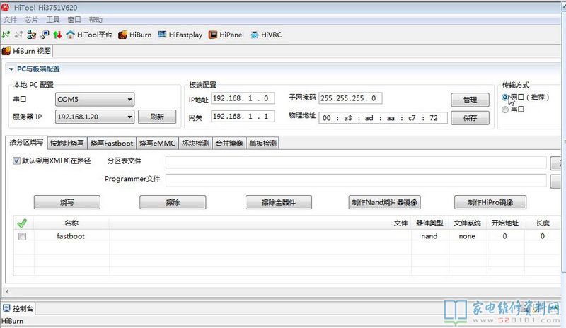 ④、选择HiBurn 功能进入烧写界面,然后在传输方式下,选择“网口”。