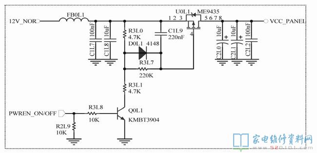 如图17 所示,当U2(Hi3751 V551)的E4 脚送来开机信号(高电平)时,Q0L1 导通,U0L1的④脚为低电平而导通,12V_NOR 供电经过U0L1,输出VCC_PANEL,用作液晶屏驱动电路的工作供电。