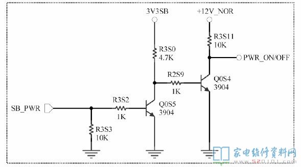 如图14 所示,在U1(HI3751)正常工作后,输出SB_PWR 开机信号(高电平),送到Q0S5的基极,使Q0S5 导通,Q0S4 截止,于是Q0S4 集电极输出高电平,此开机信号(PWR_ON/OFF)经CN0S1 的④脚送往电源板,使电源电路正常工作,得到正常的+12V、+36V 供电。