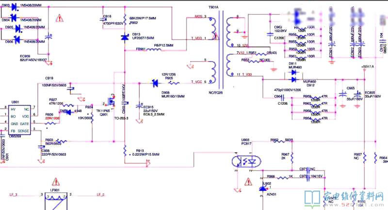 接修一台海尔LE43A31液晶电视,故障表现为红色指示灯亮度低且快速闪烁,有时插电指示灯亮度正常能开机,但几分钟后故障重现,故障出现时12V电压在6点几伏至7点几伏快速变化,测12V整流双二极管、三个12V滤波电容,AZ431,PC817正常。