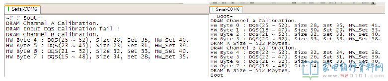 接修一台创维55E780U液晶电视(8K94机芯),故障表现不开机,首先仔细检查PCB 板正反面,没有发现缺件或者元件脱落烧毁现象。接上串口终端,通电查看打印信息如下左图,显示DRAM Channel A Calibration.fail ,即主芯片与A 组DDRU20/U21 通讯校验失败。检测主板各个供电均正常,分析此故障原因有:1、主芯片损坏;2、板材过孔不 良;3、排阻损坏;4、DDRU20/U21 损坏;5、DDR 与主芯片虚焊。首先检测排阻和板材过孔, 用万用表逐一检测排阻处对地阻值,未发现异常,怀疑主芯片MTK5326 虚焊。补焊主芯片,还是通讯不良,怀疑DDRU20/U21 损坏。没有原装nanya NTC5CB127M16HP(此DDR 为256MB 缓存的),用skhynix H5TQ2G63FFR 代换后,再次通电查看打印信息如下右图,显示DRAM Channel A Calibration OK,打印信息继续向下跑,接工装正常开机。老化,故障排除。