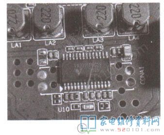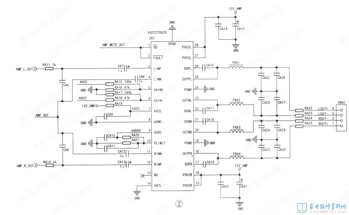 接修一台海尔LE42C31型液晶彩电,收看中突然无声,但图像一直正常。本机主板型号是CV920L-T42,搭载安卓系统。外接AV信号或HDMI信号,图像均正常,但无伴音;贴近扬声器听,也无噪声,说明伴音功放电路没有工作。本机采用HSSOP-28脚封装方式的D类功放VA222TSG28(UA1),如图1所示。