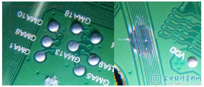 接修一台创维55G6液晶电视,采用的机芯是9R52机芯,故障表现为图像少许发白,仔细检查PCB 板正反面,没有发现缺件或者元件脱落烧毁现象。接上串口终端,通电查看打印信息显示正常,升级主程序后,接工装试机,发现刚开机时液晶玻璃呈现灰白色,进主页后图像也少许发白,和正常主板对比后才发现此故障。此板为LG EPI 接口,主板电路与 TCON 电路二合一,怀疑TCON电路损坏。更换U0N1 RT6937,故障依旧。仔细研究,发现GMA10 电压不对,正常为7.8V 左右,此板只有5V。顺着GMA10PCB 走线,发现PCB被划伤导致 GMA10PCB 走线断裂,如下图,用铜线连接后,再次试机,图像正常。老化,故障排除。